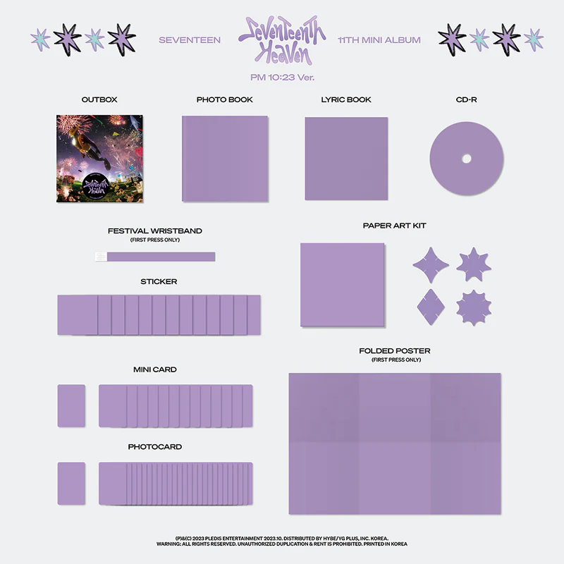 Taking the world by a storm with their hit song “Super,” SEVENTEEN is back with their latest 11th Mini Album ‘SEVENTEENTH HEAVEN.’ Available in 3 versions: AM 5:26 Ver., PM 2:14 Ver., PM 10:23 Ver. Contents of the album include: CD, Outbox, Photo Book (80 pgs), Lyric Book (12 pgs), Photo Card (random 2 of 26), Mini Card (random 1 of 13), Sticker (random 1 of 13) and Paper Art Kit. First Press Only: Folded Poster and Strip Wristband. NA Retail Exclusive: Postcard. Dimensions: 158 x 161 x 36 mm.