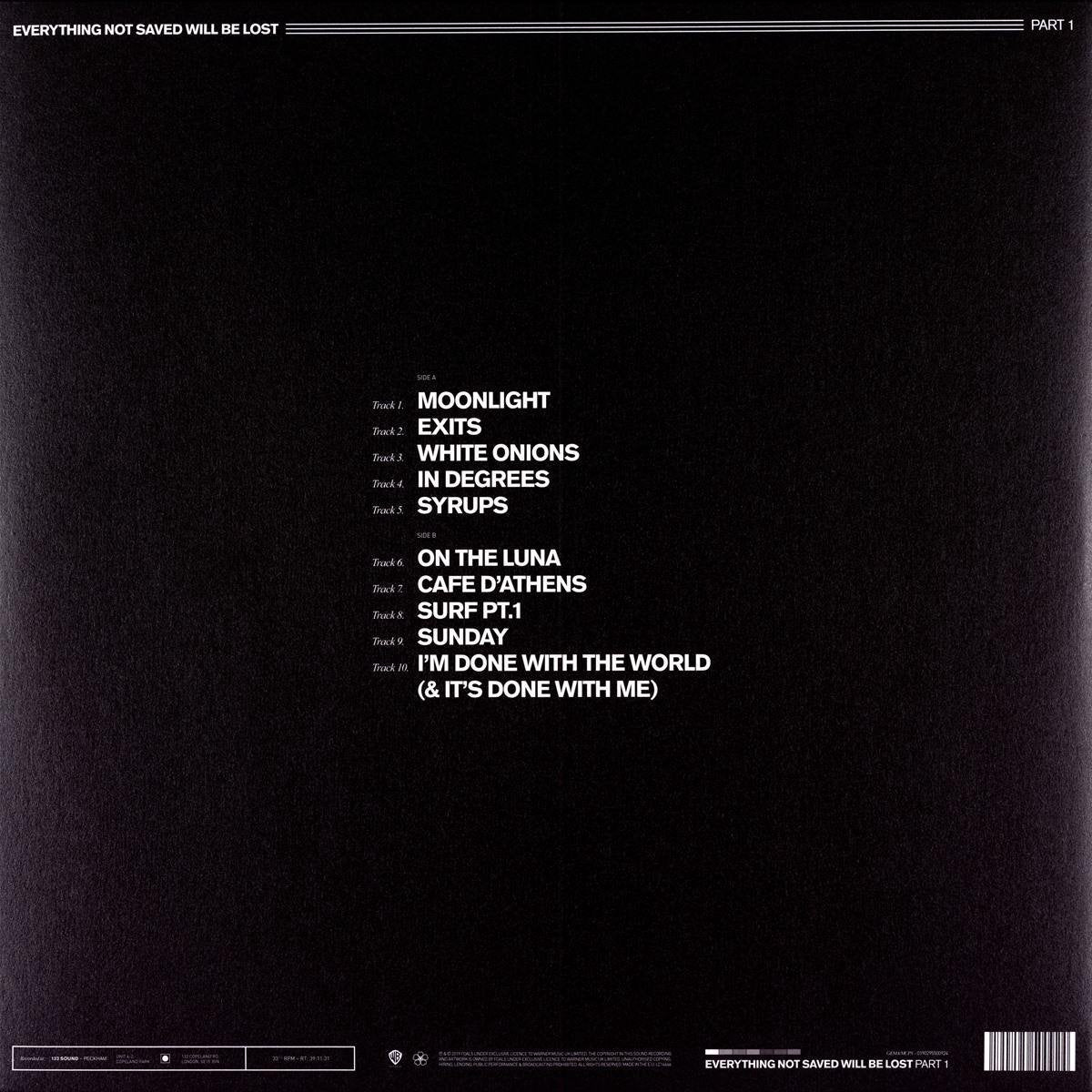 Everything Not Saved...Part I by Foals, released 7 March 2019, includes the following tracks: "White Onions'", "Syrups", "Cafe D'athens", "Sunday" and more. This version of Everything Not Saved...Part I comes as a 2LP..