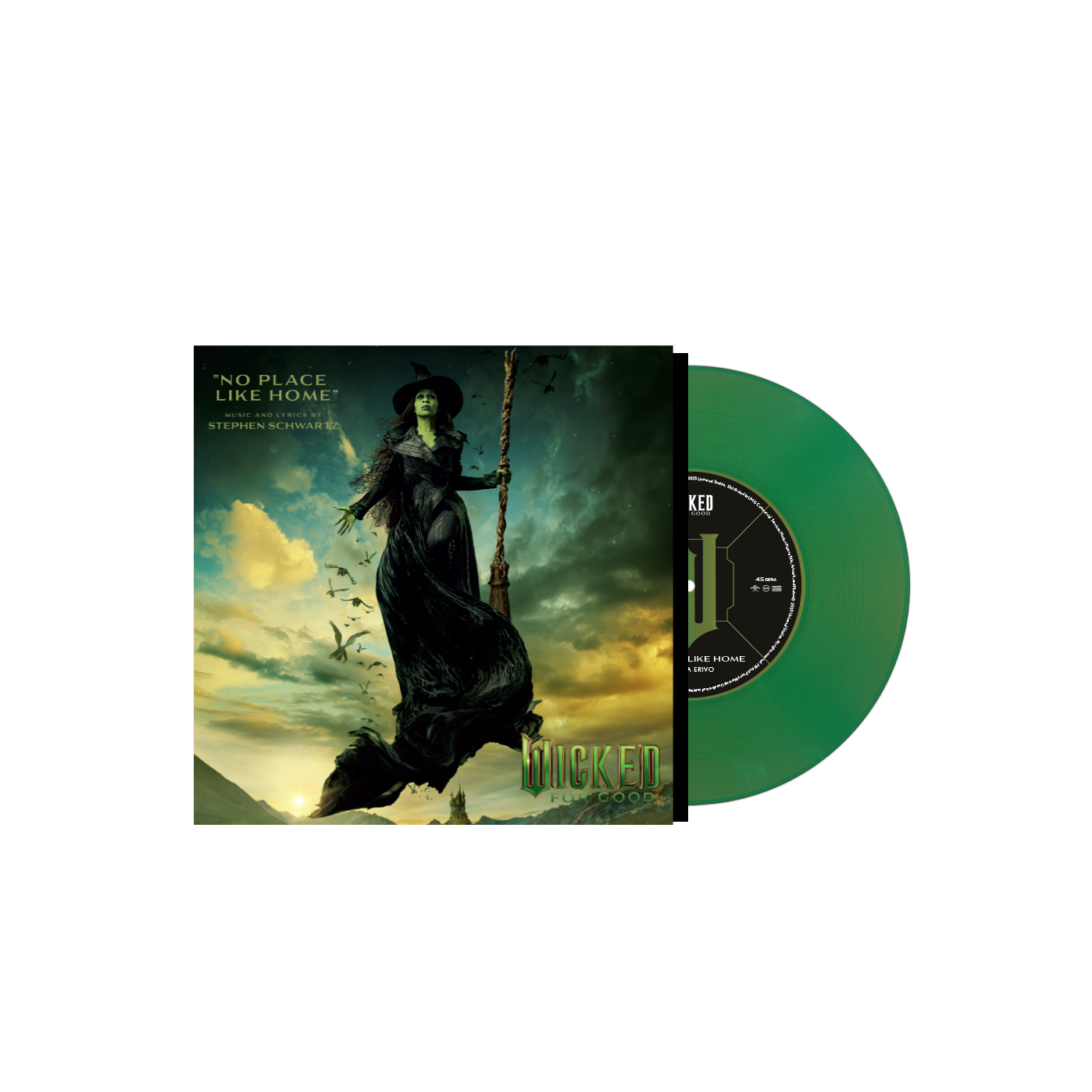 Limited edition green 7” vinyl featuring “No Place Like Home" and “No Place Like Home - Instrumental.” Wicked: For Good – The Soundtrack, features performances by the stars of the emotional, electrifying conclusion to Universal Pictures’ global cinematic Wicked sensation, Wicked: For Good. Wicked: For Good – The Soundtrack follows last year’s acclaimed, history-making release of Wicked: The Soundtrack, which marked the highest debut ever for a theatrical adaptation of a stage musical. With music and lyrics by legendary Grammy and Oscar® winning composer and lyricist Stephen Schwartz, the soundtrack includes two new original songs featured in the film: “No Place Like Home” performed by 3x Academy Award® nominee, Grammy-winning Cynthia Erivo as Elphaba, and “The Girl In The Bubble” performed by Academy Award® nominee, Grammy-winning Ariana Grande as Glinda. In addition, “The Wicked Witch of the East” is exclusively featured on the film soundtrack. It has never previously been released as part of the Original Broadway Cast Recording. The soundtrack also features fan-favorites “Thank Goodness,” “As Long As You’re Mine,” “No Good Deed,” and the title track “For Good.” Wicked: For Good arrived in theaters November 21, 2025.